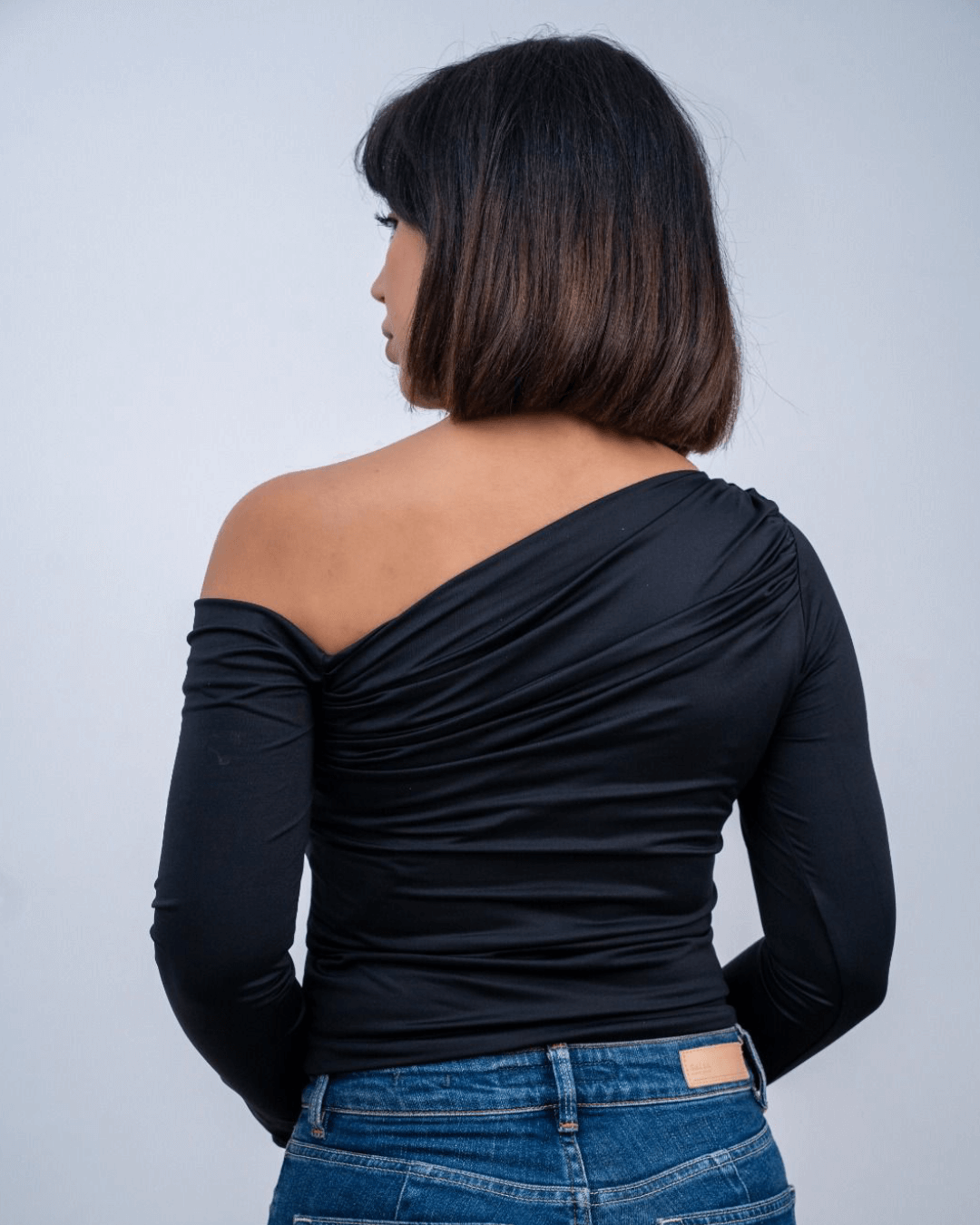 A soft, asymmetrical one-shoulder top that blends simplicity and femininity for an everyday refined look.